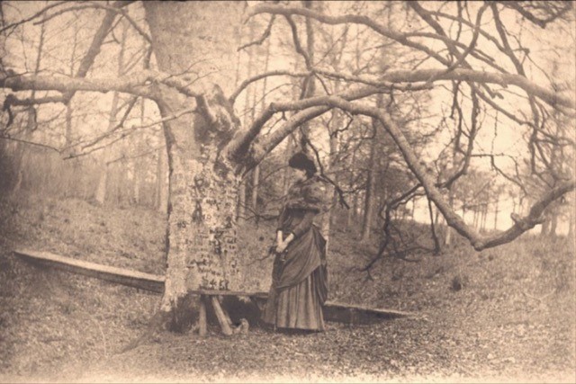 Hi Michael, This is to congratulate you on your amazing ancestry website that I found in a link from the website for Coldharbour Church, Surrey. I live with my daughter and her family at Taylors Farm, actually in the Coach House, on the old Broadwood estate surrounding their country house of Lyne. So it is through that connection I have taken an interest in their family history, personalities and the piano making business. Lyne House is now divided into apartments but they still have a Broadwood grand piano in the hallway. They have an English country dancing event each May 1st to honour Lucy Broadwood, the folk music collector who once lived there. The person that interests me particularly is Ada Broadwood (nee Heath) who I was initially afraid your site didn’t really mention but before I’d explored the extent of it! The Surrey Mirror’s coverage of her wedding amazed me and the list of presents intrigued my daughter whose comment was, ‘would you want your gift splashed across the local paper’! I found the attached photo in a Broadwood album in the Surrey History Centre which is captioned, ‘Ada in Rome Wood under the family tree 1888’. I spent a couple of sessions in Rome Wood looking for that beech but unfortunately time and possibly the extent of initial carving into the trunk must have taken their toll !